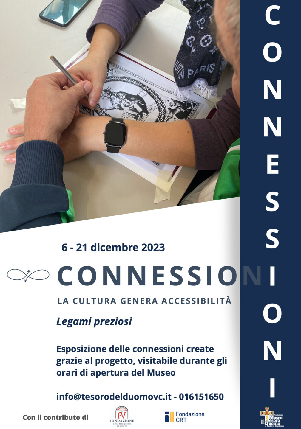 Visibili, gratuitamente e durante gli orari di apertura del Museo, gli elaborati prodotti da persone con disabilità e dalle studentesse della 5A del Liceo Scienze Umane di Vercelli. La mostra sarà anche l’occasione per lanciare i tre episodi video realizzati da alcuni studenti in PCTO, dalle volontarie di Vercelli Giovani Servizio Civile impegnate nel progetto “Musei Connessi” con la straordinaria partecipazione della prof.ssa Carla Barale e del geom. Giorgio Ferrari, invitati a rivivere importanti momenti della storia recente di Vercelli. A partire dal 6 dicembre i video saranno inoltre disponibili sul canale Youtube della Fondazione Museo del Tesoro del Duomo e Archivio Capitolare di Vercelli. Il progetto Connessioni è supportato da Fondazione Cassa di Risparmio di Vercelli, Fondazione Cassa di Risparmio di Torino e dal riparto dei fondi 8x1000 della CEI.