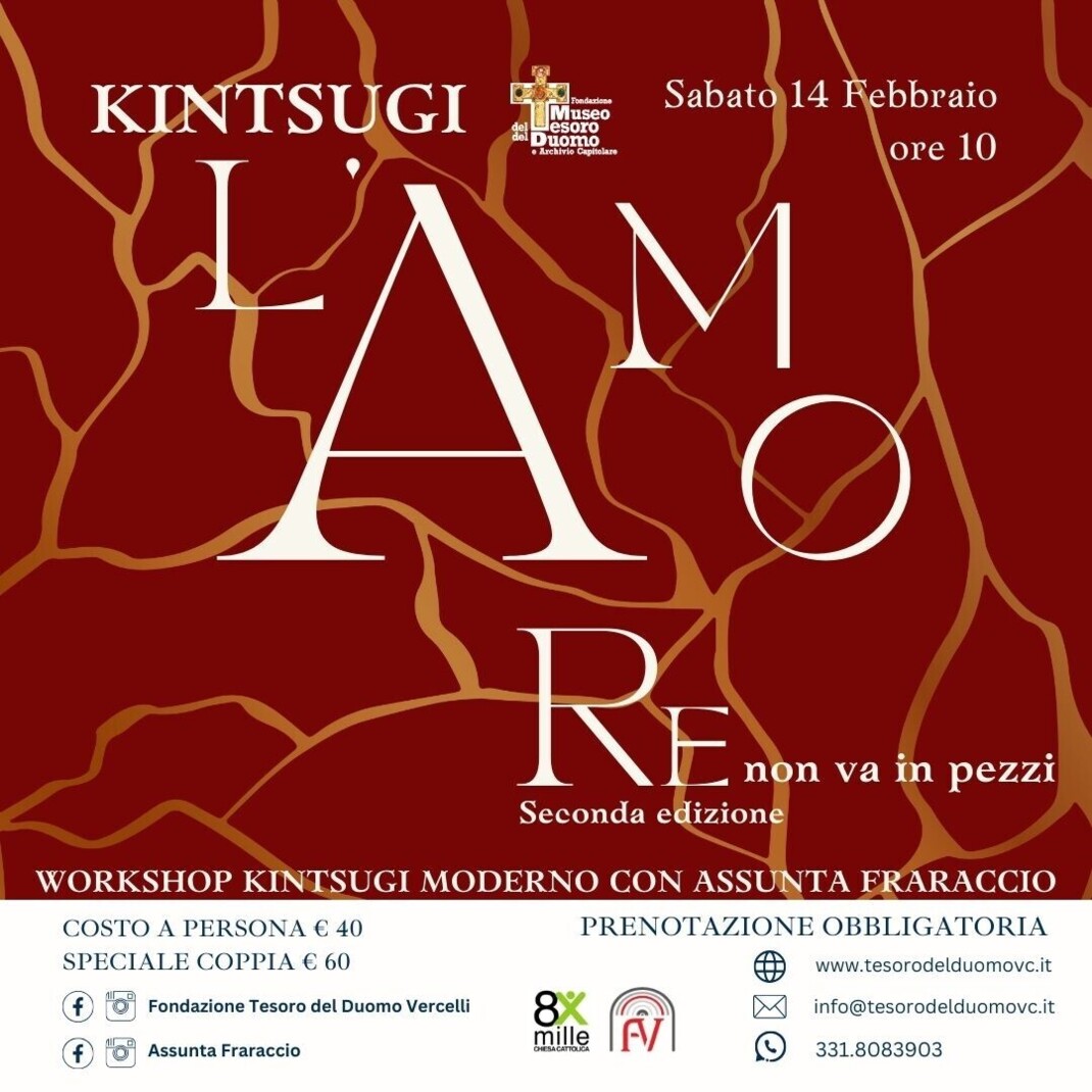 Il Museo del Tesoro del Duomo di Vercelli sabato 14 febbraio alle ore 10.00 ospiterà la seconda edizione del workshop Kintsugi – L’amore non va in pezzi, dedicato all’arte giapponese del Kintsugi, simbolo di cura, trasformazione e valorizzazione delle fratture. L’incontro sarà condotto da Assunta Fraraccio, che guiderà i partecipanti in un percorso pratico di Kintsugi moderno.